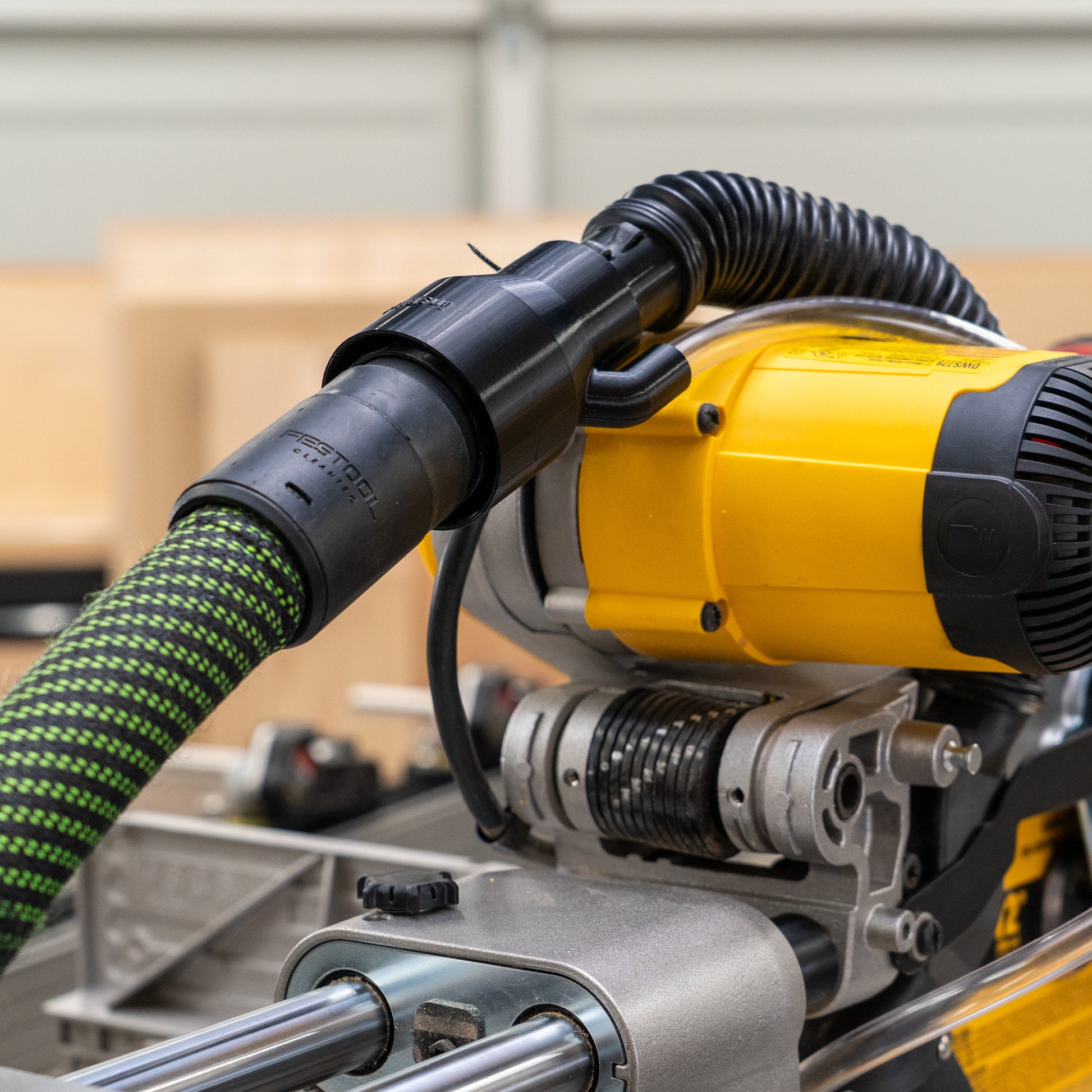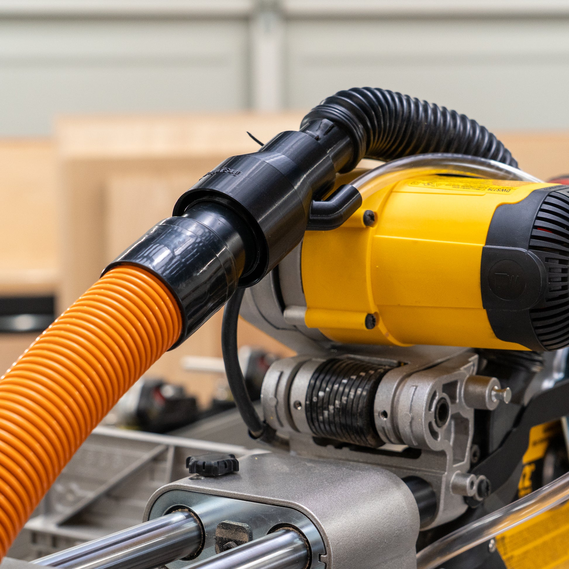 - Vacuum Adapter. This is what allows everything to work together. On the vacuum side you can hook up to almost any extractor, shop vacuum or even a dust collector. It will accept 2-1/2" dust collection hose, 2-1/2" shop vacuum hose, 1-7/8 shop vacuum hose or 36mm Festool antistatic hose. On the tool side there are two ports. One port is to hook up the 1-5/8" hose cuff from your aftermarket behind-the-blade unit. The other port is sized to fit the supplied 1/2" outside diameter vinyl hose OR can be used with 5/8" inside diameter hose (not included or available from us). All fittings are tapered to provide a secure connection to a wide variety of brands of hoses, both new and old.