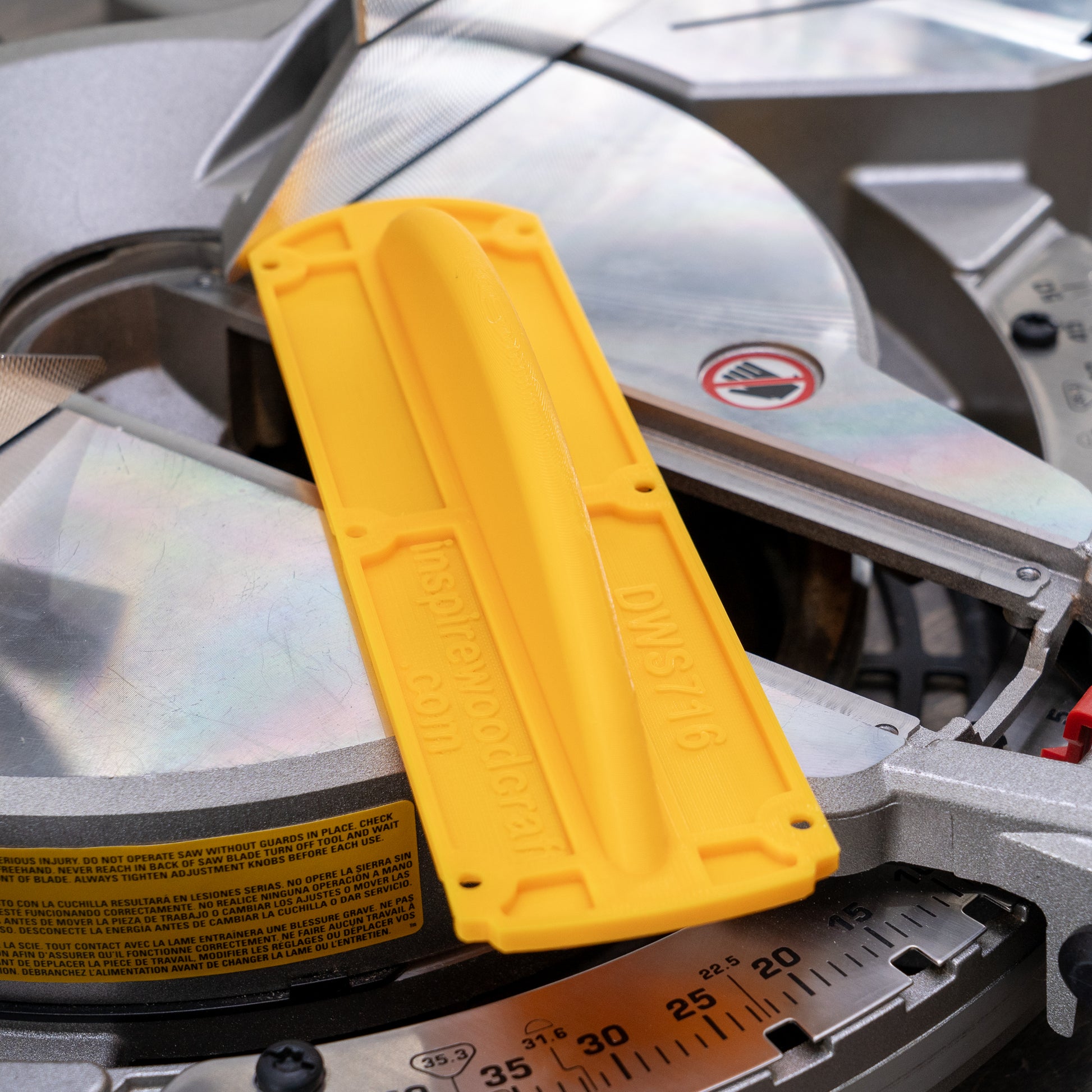 The Gen 2 Zero Clearance Dust Collection Throat Plate for the DeWALT DWS716 installs in less than a minute. Simply remove the six T-20 screws that hold the factory throat plate in, take out the factory plate, slide the Dust Collection Throat Plate in, and secure it reusing the factory screws.